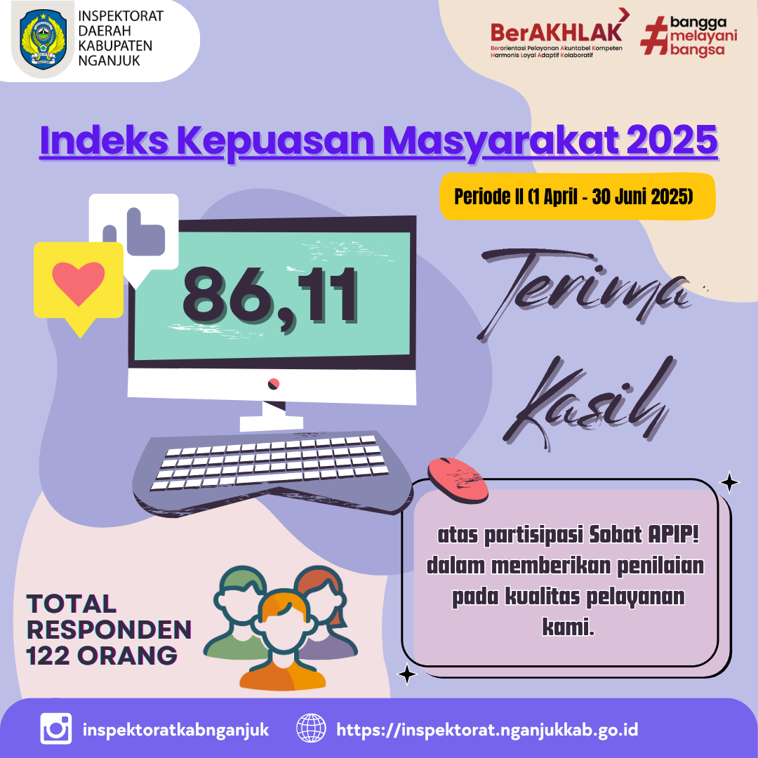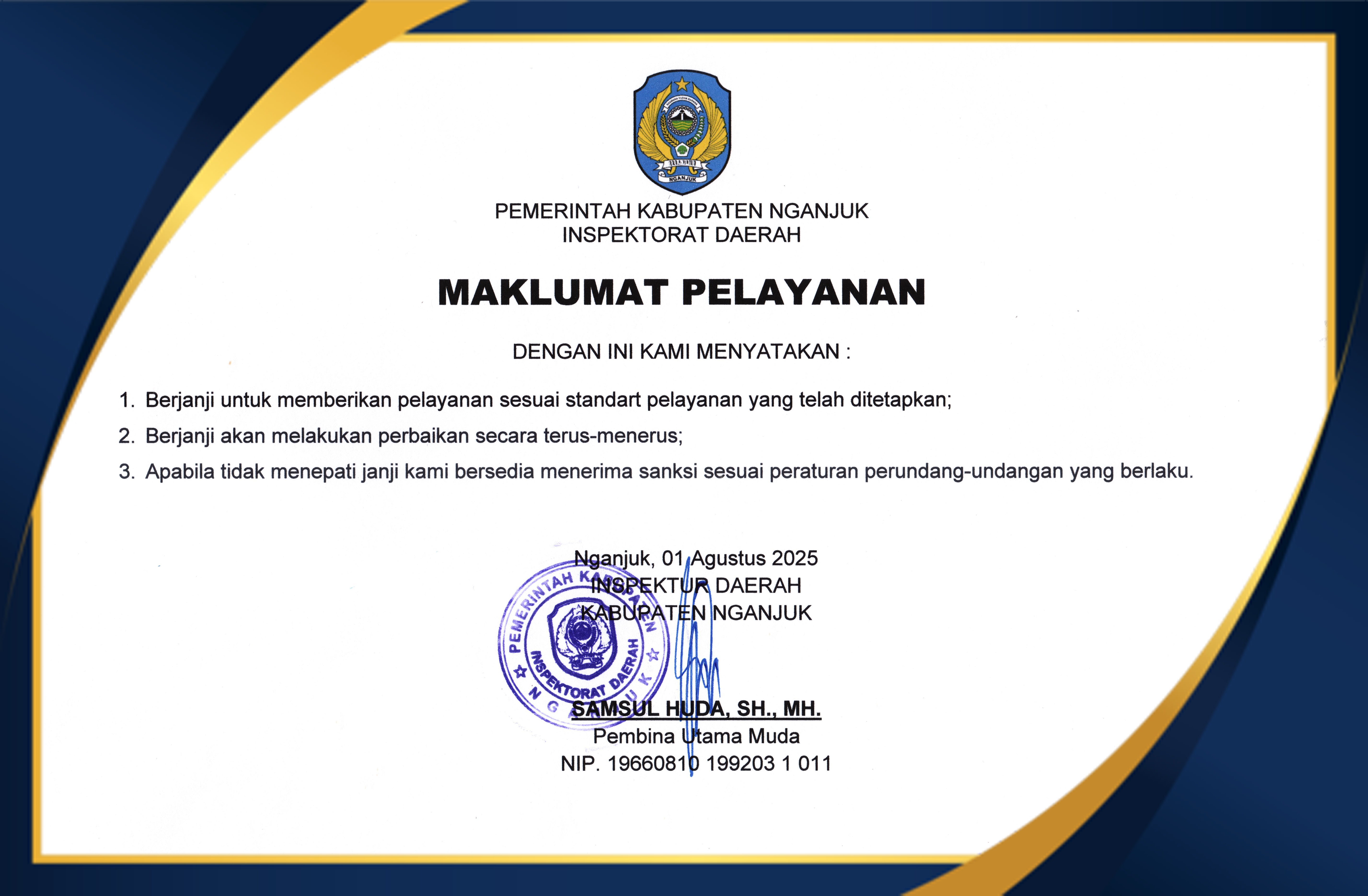 Mengacu pada Keputusan Inspektur Daerah Kabupaten Nganjuk Nomor 188/22/K/411.200/2022 Tanggal 15 Februari 2022 tentang Penetapan Standar Pelayanan pada Inspektorat Daerah Kabupaten Nganjuk.